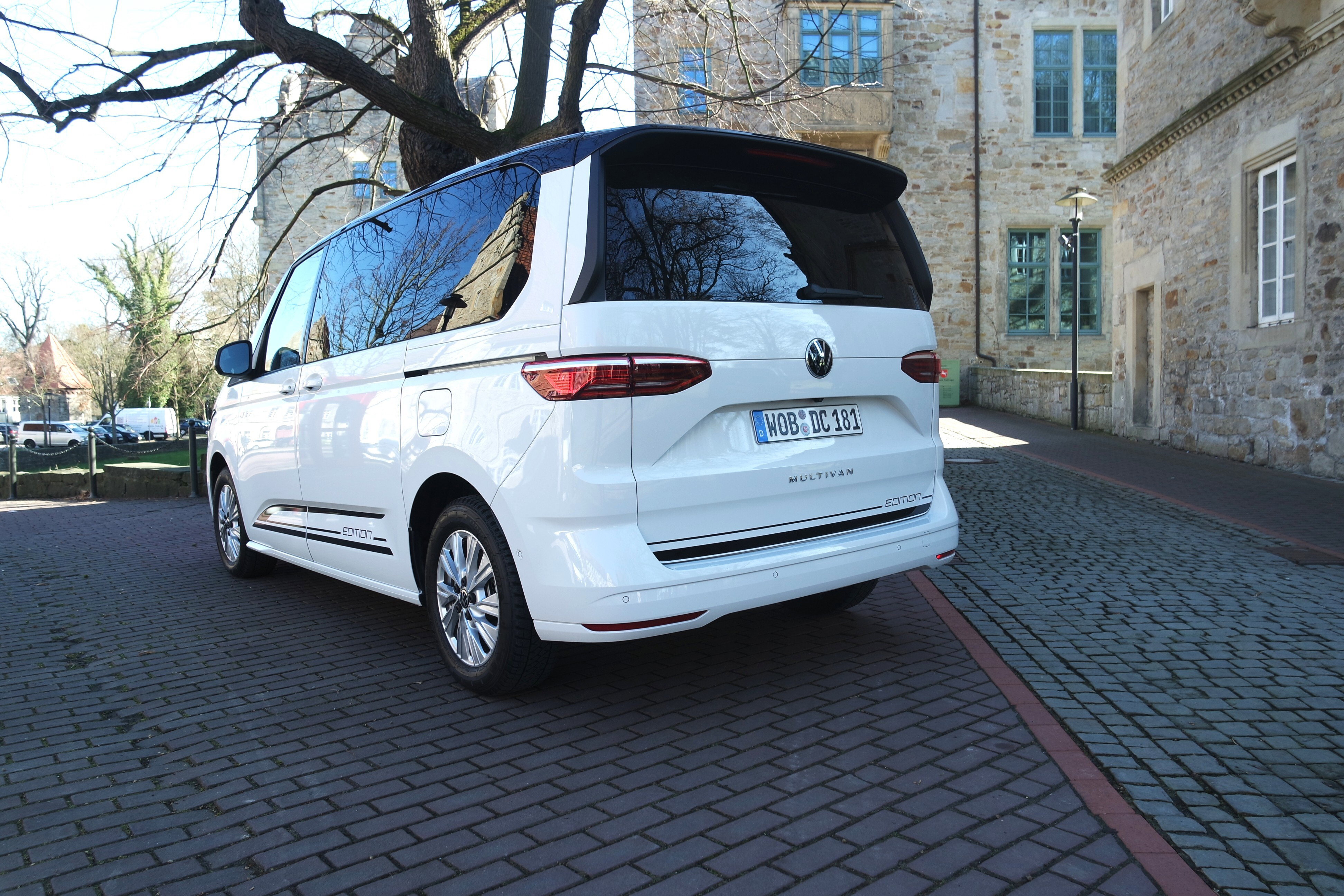 Meine Bulli-Erfahrung frischt gerade der mit der offiziellen Typenbezeichnung Volkswagen Multivan Edition 2.0l 110 kW 7G.-DSG auf, in einem strahlenden Weiß, dass eher aggressiv als unschuldig wirkt, weil es von Schwarz an Dach und Seiten betont wird.