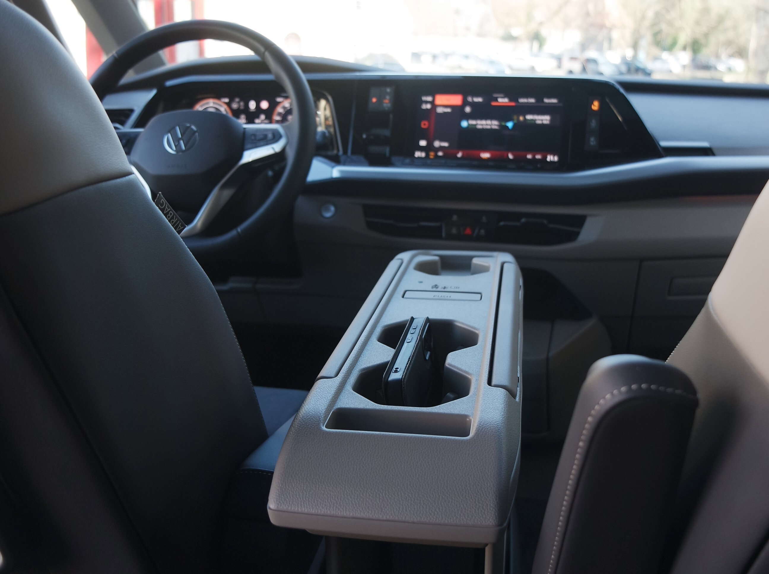 Fahrer und Beifahrer können bei solchen längeren Touren in Ruhe die bunte Welt der „Breitwand“-Displays vor Augen genießen und sich vergegenwärtigen, wie weit es der Transporter von damals gebracht hat: heute digitale Begleitung und Kommentierung vom teilautonomen Fahren, damals ein Rundinstrument mit Tacho in einem Blechwulst, der nur von einer Öffnung für den unförmigen Lautsprecher des Autoradios in der Mitte unterbrochen wurde.
